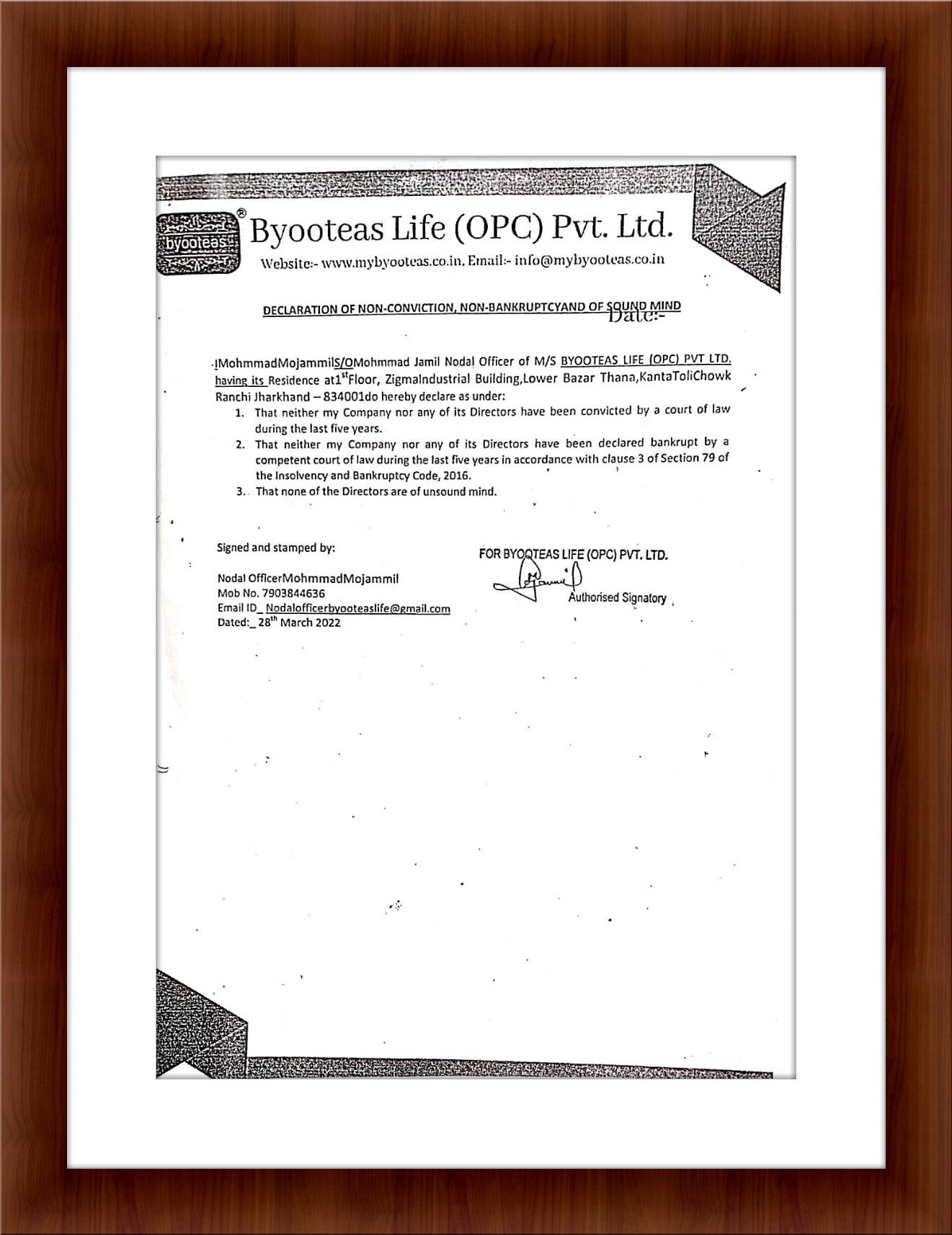 DECLARATION OF NON-CONVICTION, NON-BANKRUPTCY & OF SOUND MIND