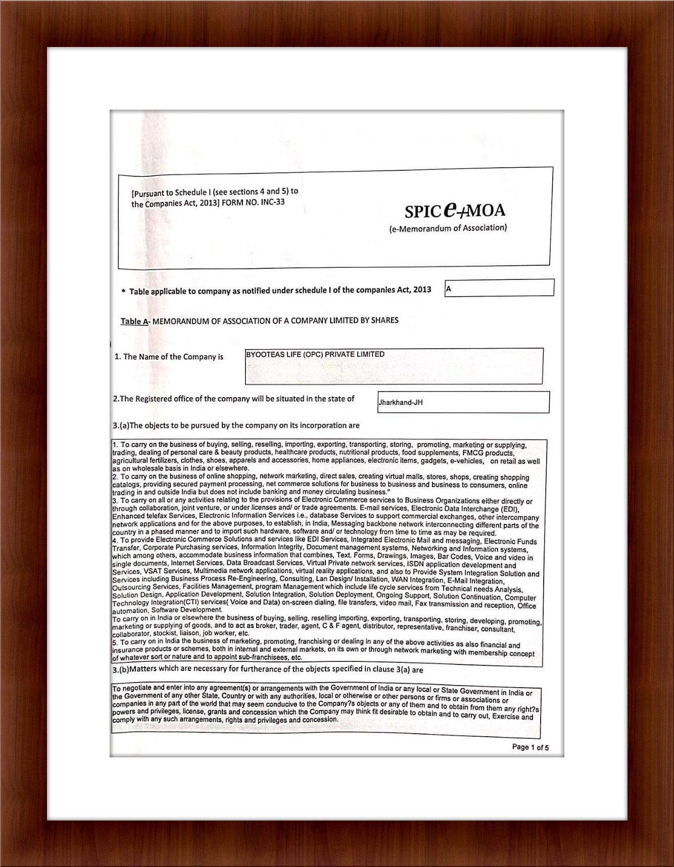 MEMORANDIUM OF ASSOCIATED A COMPANY LIMITED BY SHARES