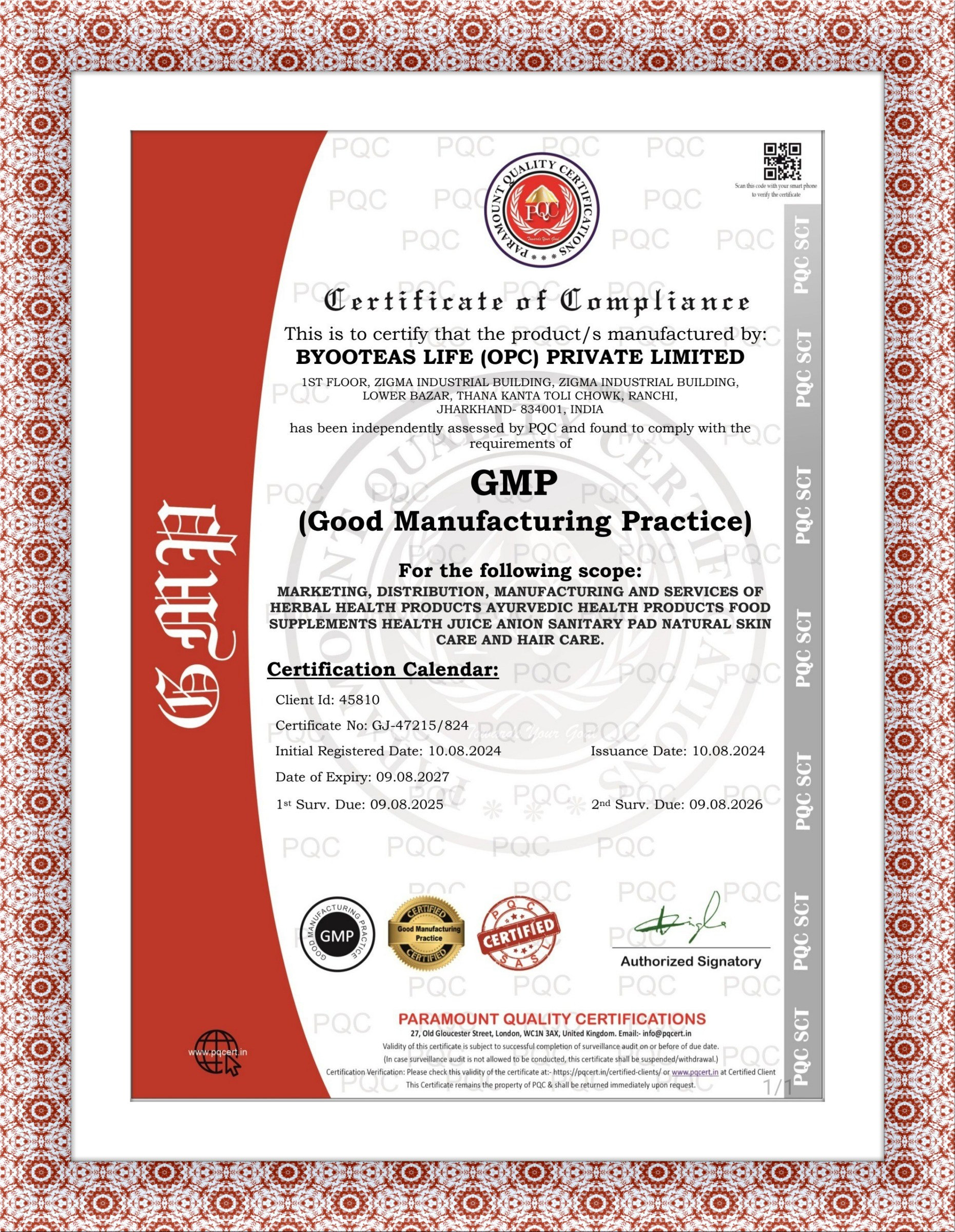 CERTIFICATE OF COMPLIANCE (GMP)