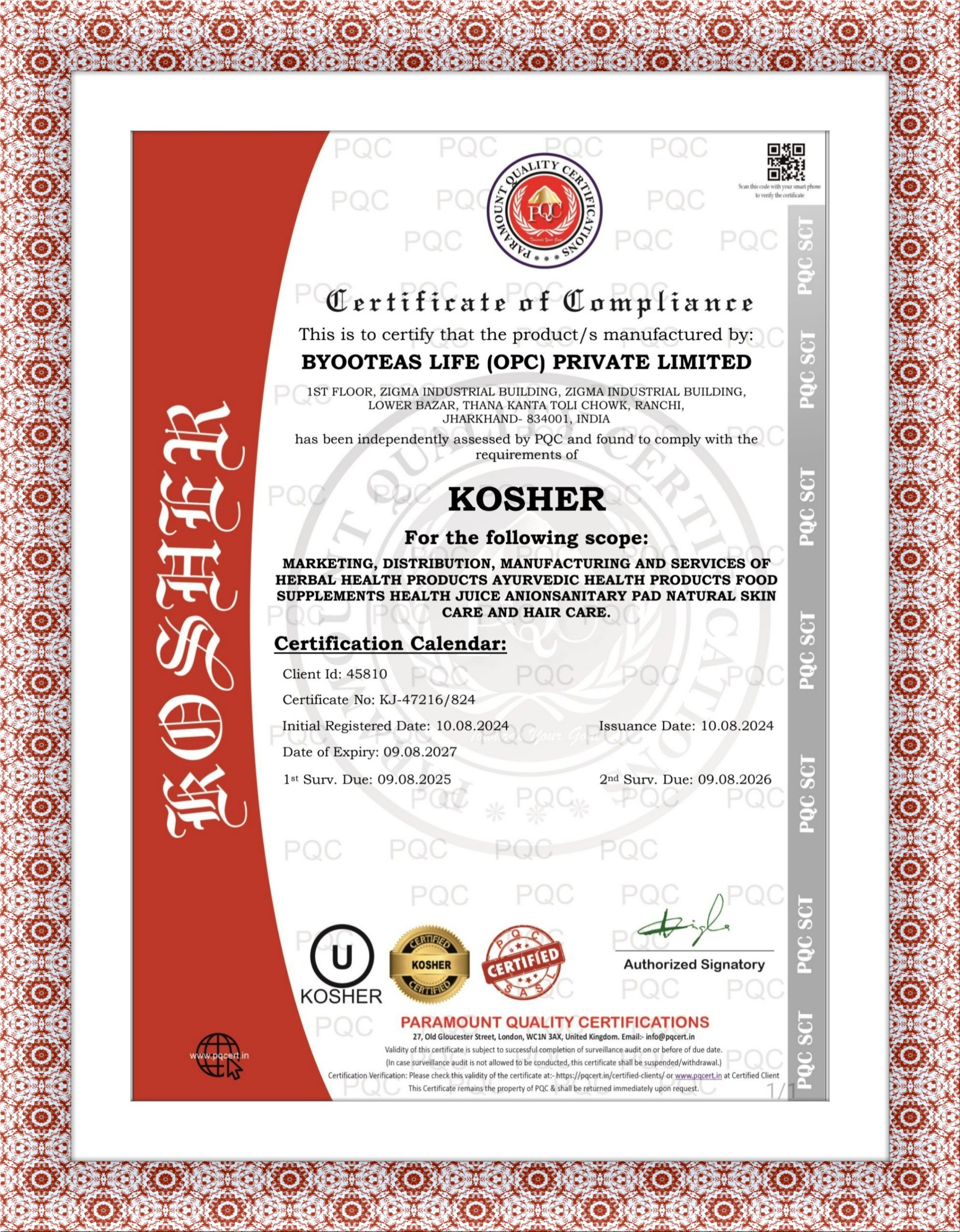 CERTIFICATE OF COMPLIANCE (KOSHER)