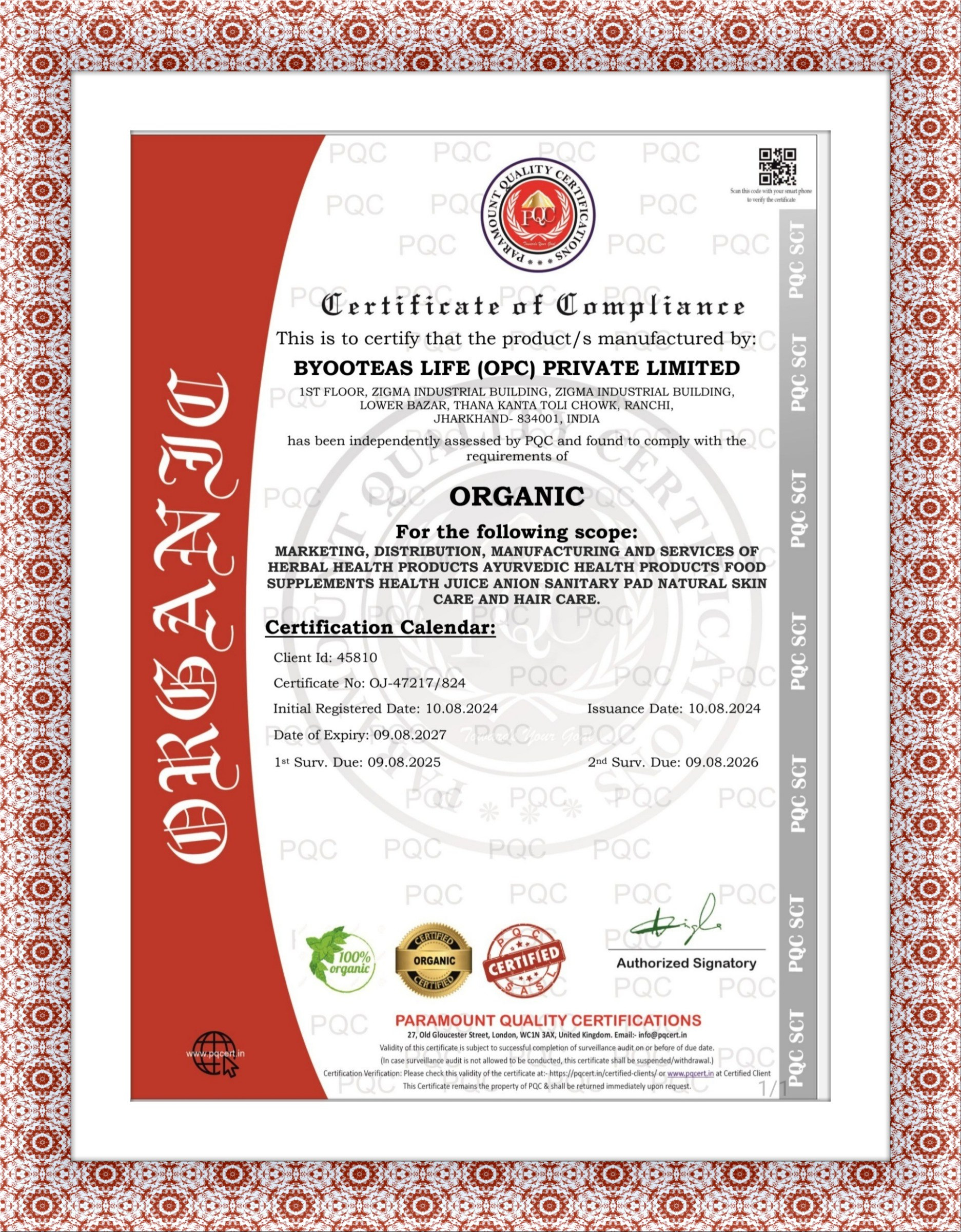 CERTIFICATE OF COMPLIANCE (ORGANIC)